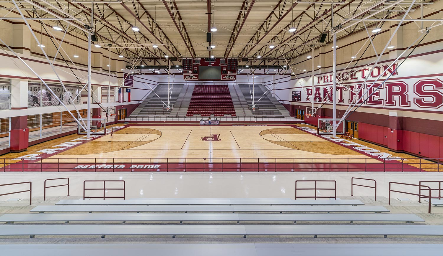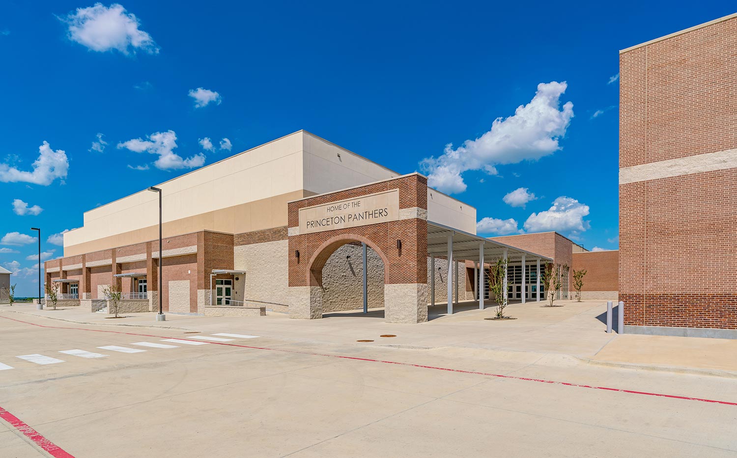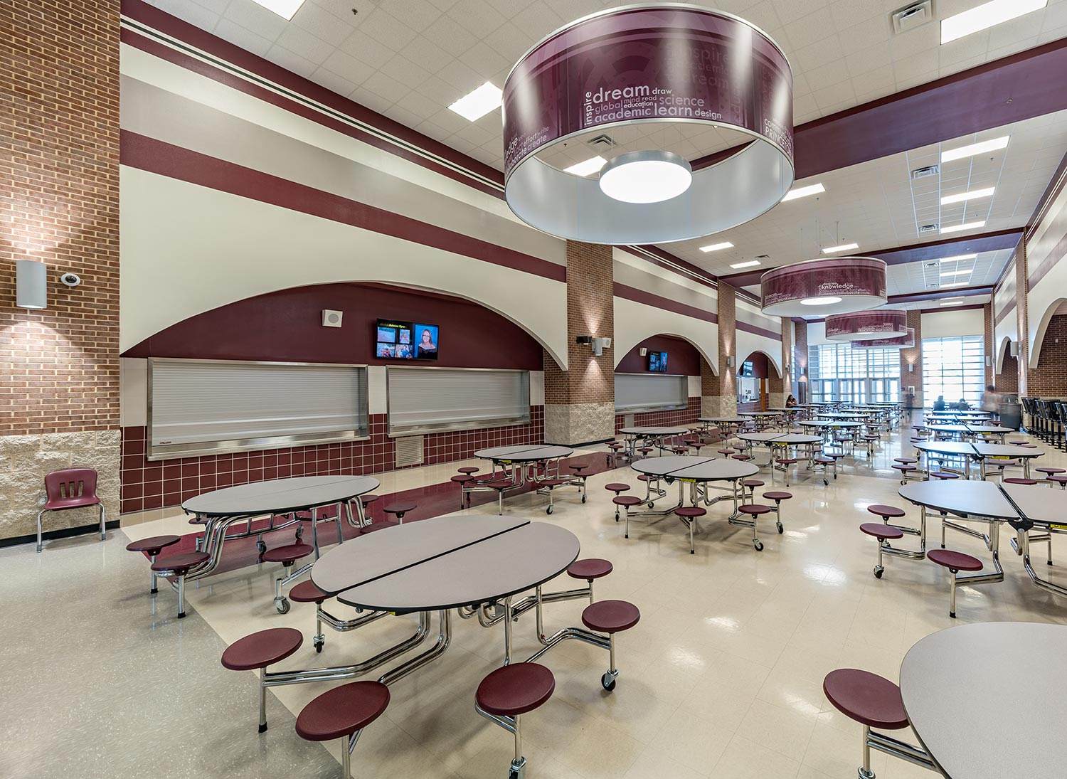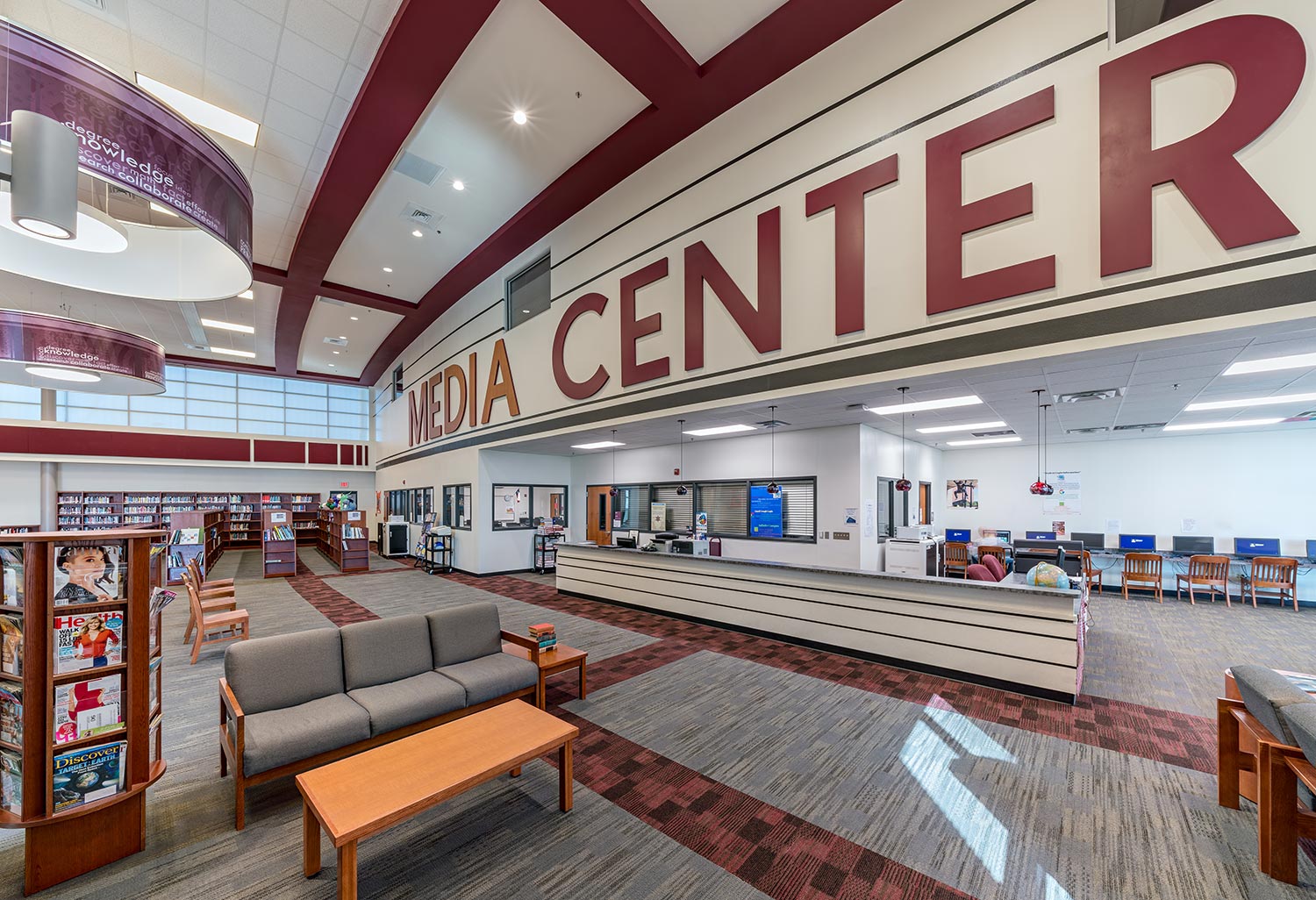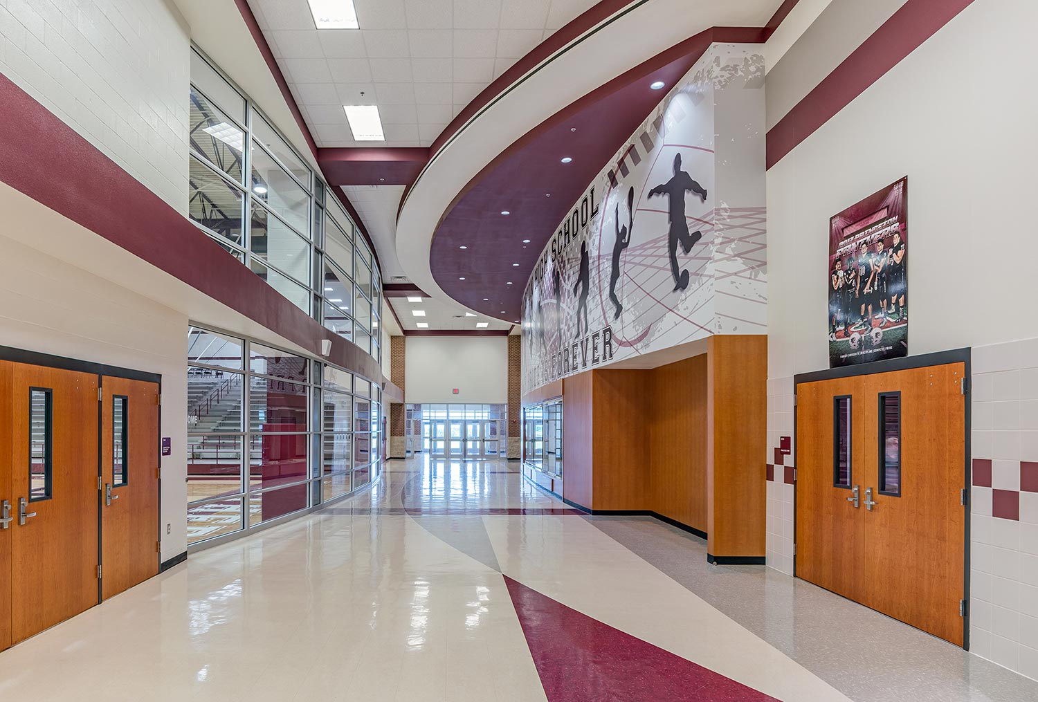 This high school, serving grades 9–12, includes a dining hall, competition and practice gyms, administration areas, media center, fine arts spaces, classrooms, a choir room, band hall, and a counseling suite. Thoughtful planning addressed the challenge of expanding a campus originally not designed for growth. A new wing was added between two existing buildings, creating an academic loop around an outdoor learning space. This addition doubles campus capacity to 1,600 students while maintaining adjacency to the stadium and a new CATE building. Creative repurposing of the existing media center into a counseling suite and conversion of the fine arts suite into a technical theater shop enhanced student services and expanded program space.