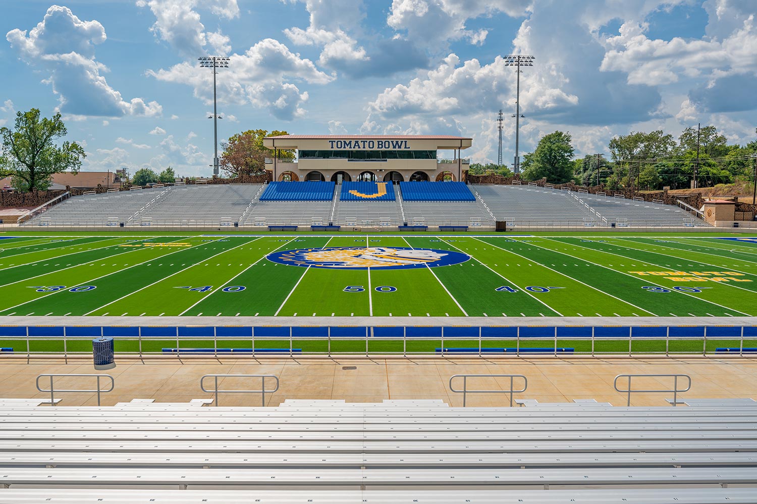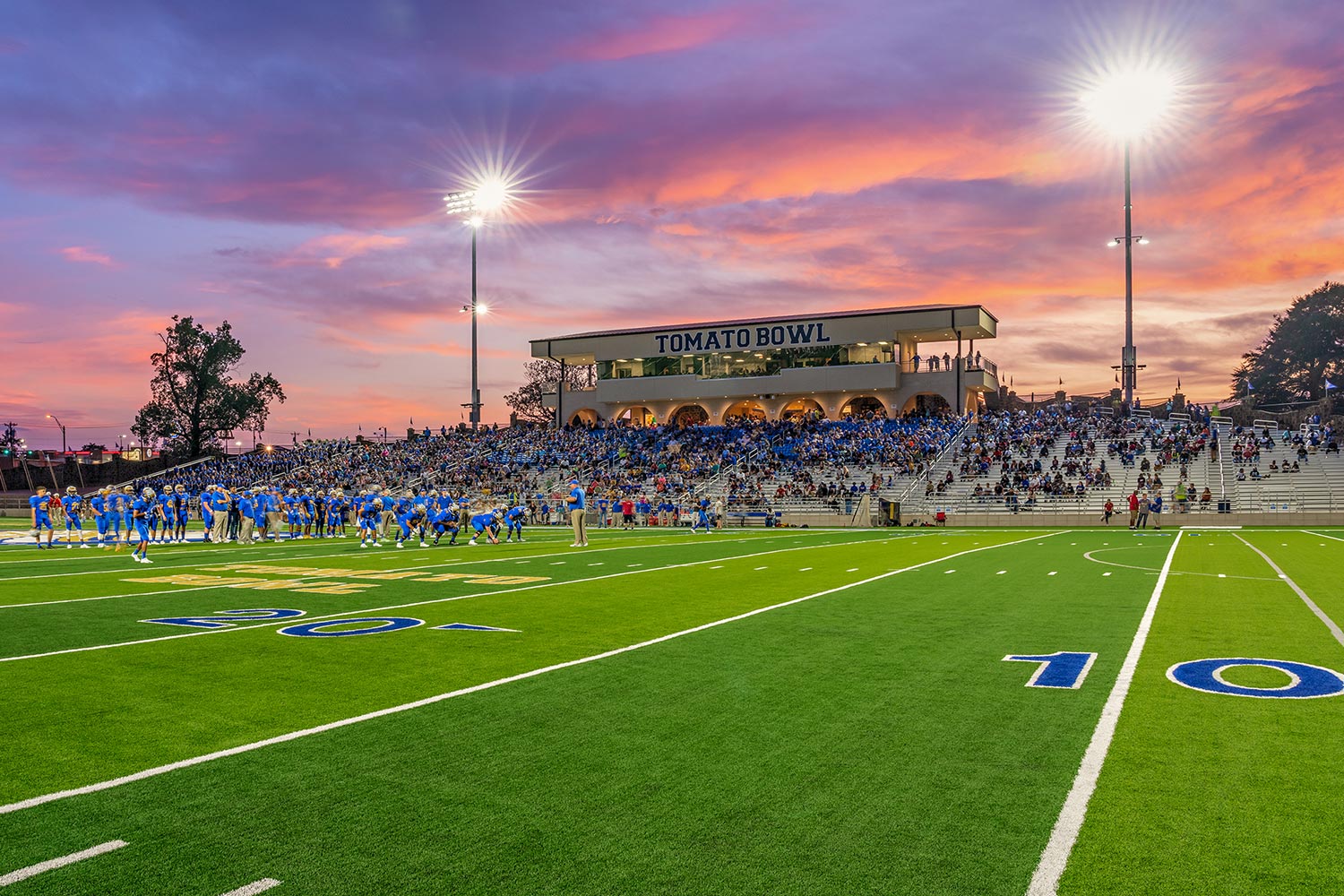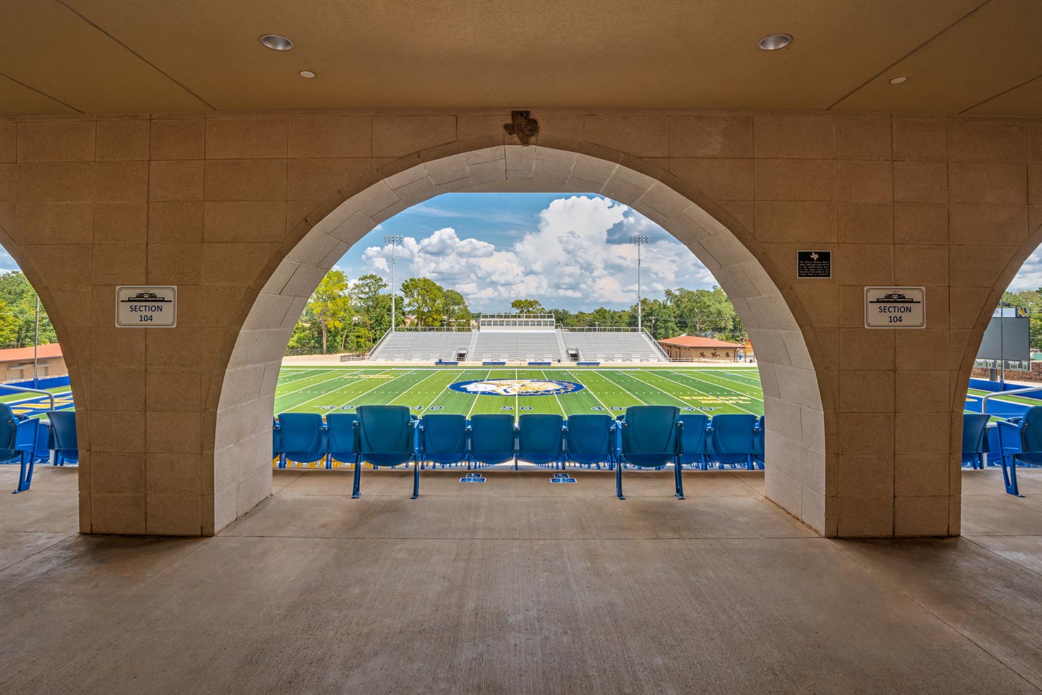 Full architectural and engineering services, from pre-planning and bond assistance through programming, design, construction administration, and warranty follow-up. This project preserves an 80-year-old Works Project stadium, blending historic renovation with modern upgrades. Shifting the field 40 yards added 2,000 seats, a secondary band entrance, and ADA/team drop-off parking. The updated 8,300-seat stadium includes renovated structures, a new press box, home and visitor locker rooms, concessions, restrooms, new aluminum bleachers, artificial turf with improved drainage, playing fields, security gates, signage, scoreboard, parking, and landscaping.